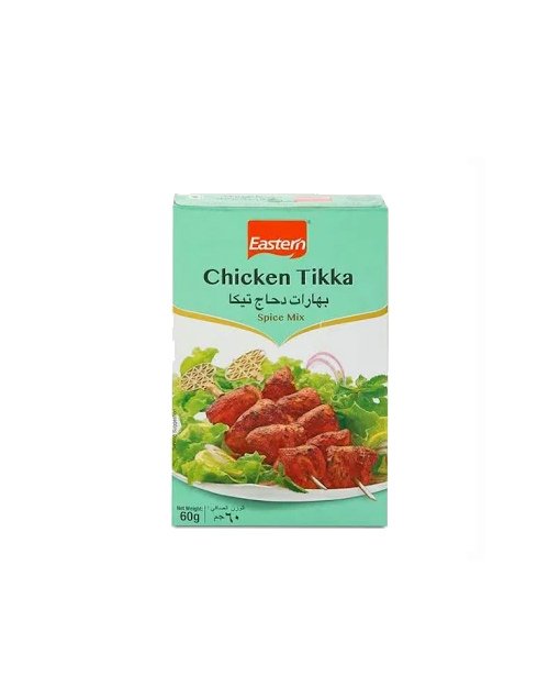 Eastern Chicken Tikka is a spice mix used for preparing chicken tikka dishes. It contains a blend of ground spices that adds taste, aroma, and color. Used for marinating chicken pieces before cooking. The mix blends well with yogurt and other ingredients. Suitable for grilling, baking, or pan cooking. A common spice mix used in kitchens.